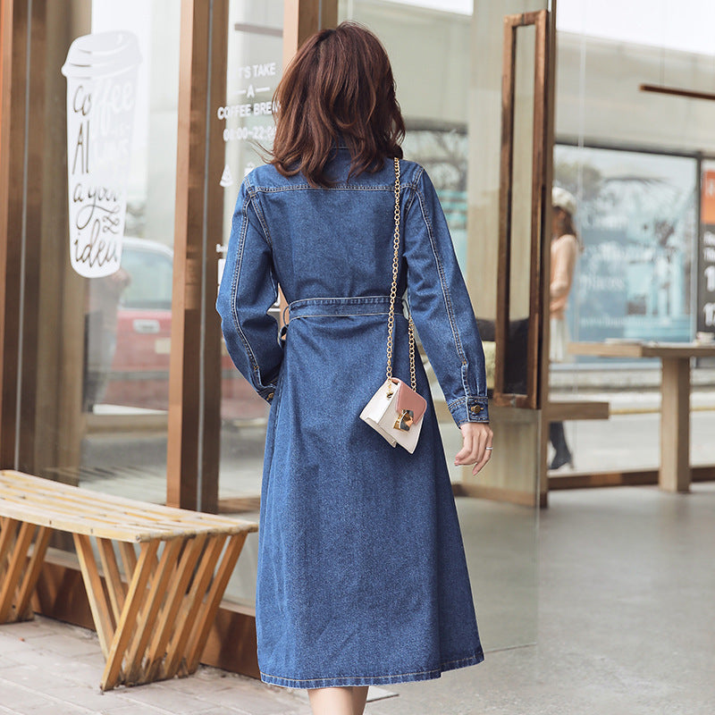 Denim Dress Women Korean Style Loose Waist Bow Tie Denim Trench Coat