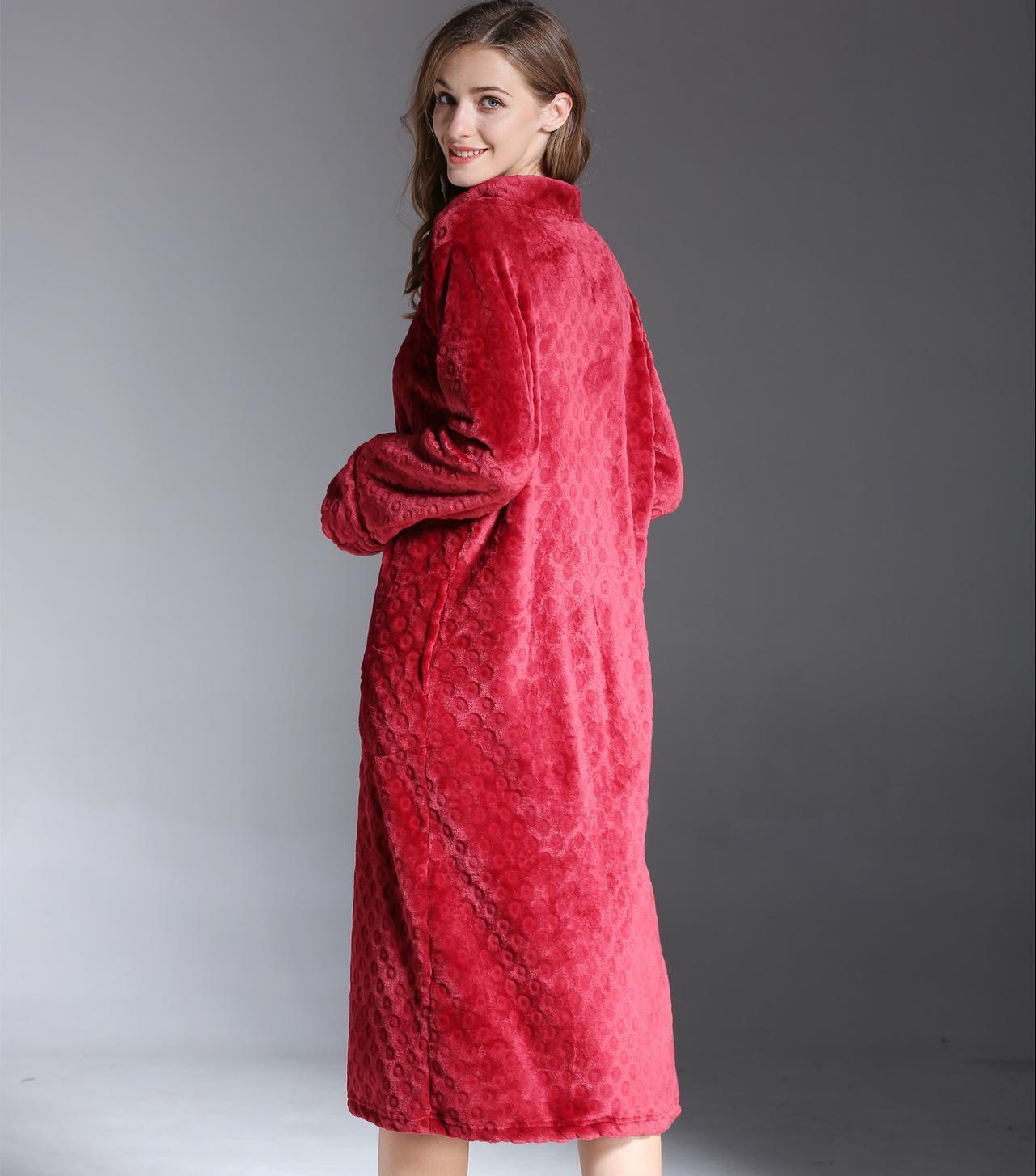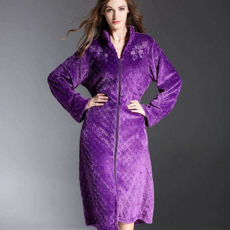 Flannel Nightdress With Exquisite Embroidery And Long Zipper Nightgown