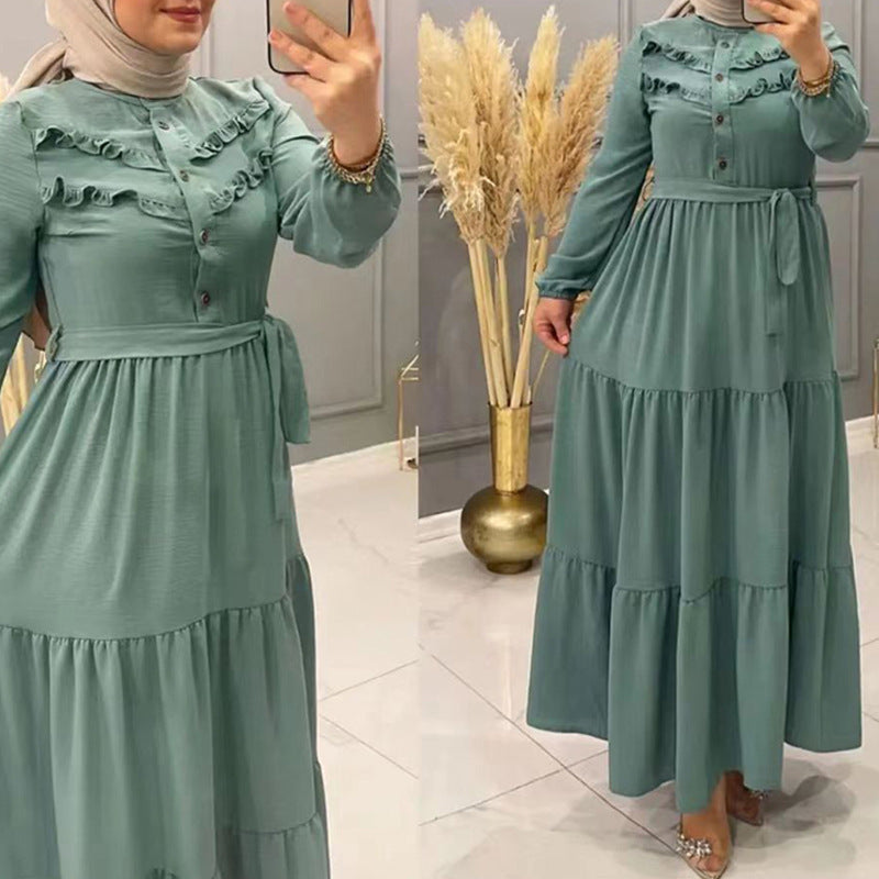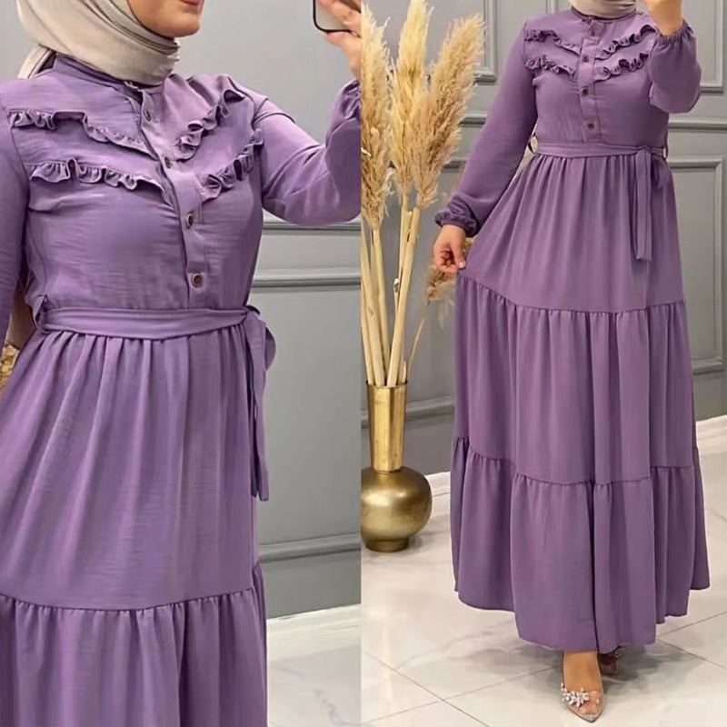 New Muslim Robe Solid Color With Belt Fashion Casual Dress