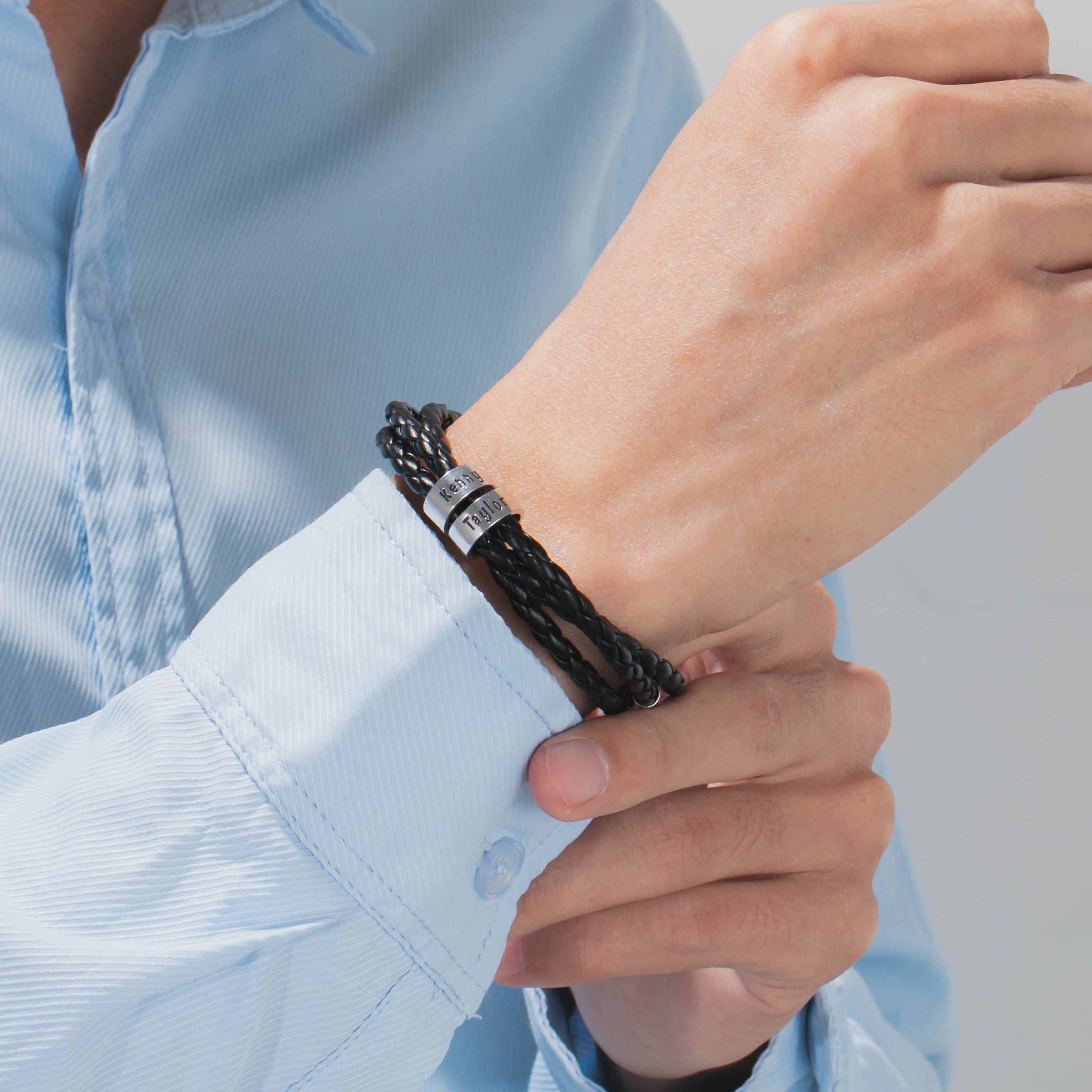 Personalized Mens Braided Genuine Leather Bracelet Stainless Steel Custom Beads Name Charm Bracelet For Men With Family Names