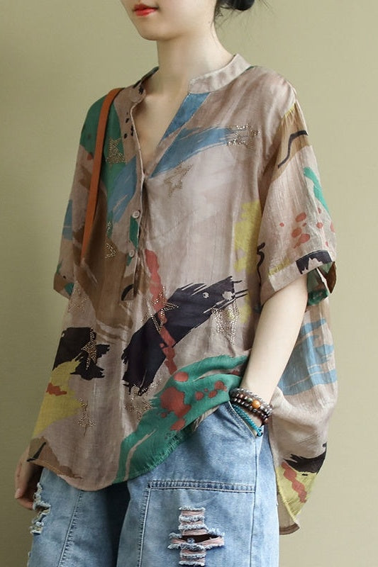 Vintage Printed Shirt Women''s Middle Sleeve Large Shirt Summer